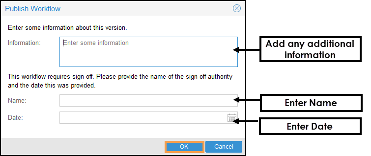 The Publish Workflow pop-up displays. - Complete the Publish Workflow details: