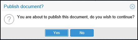 A notification displays "You are about to publish this document, do you wish to continue?".