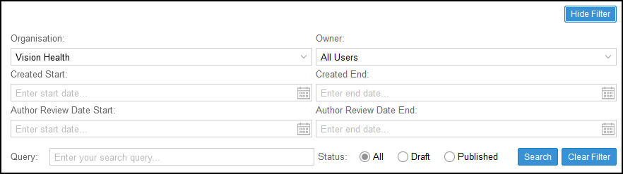 Use the drop-down lists to filter on: - Organisation