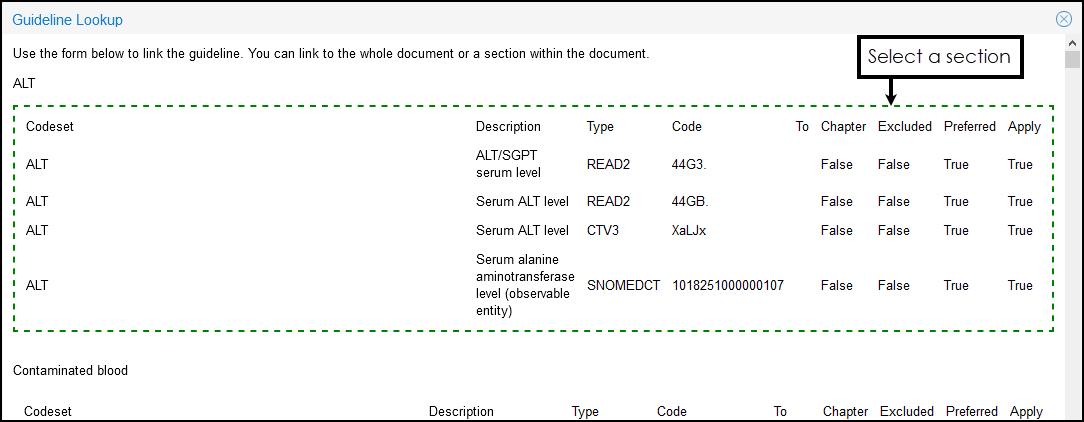 - From the Guideline Lookup, choose the section within