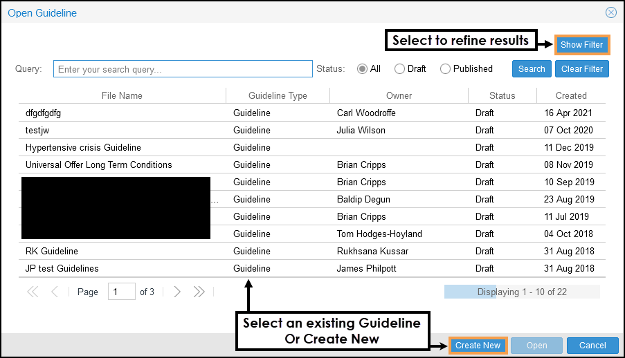 Note - If you already have a Guideline linked to the Workflow the linked Guideline displays for you to select a section, to access a different Guideline select Search.The Open Guideline pop-up displays.