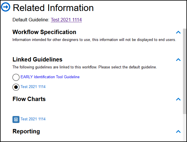 Displays any Guidelines linked to the Workflow, indicating which is the default Guideline. -