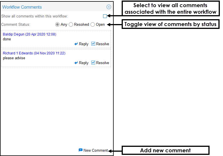 - From the Workflow Comments pop-up select New Comment.