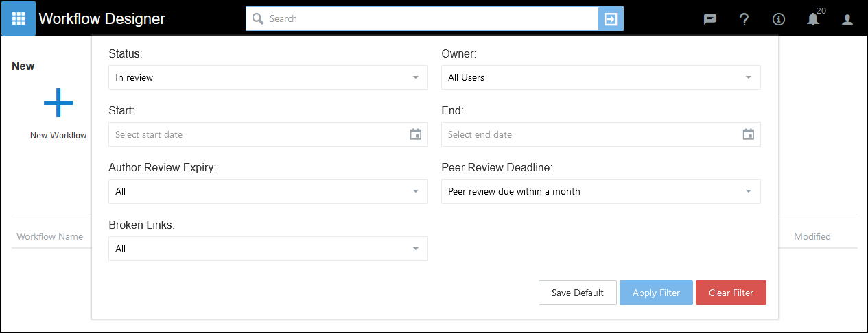 Note - The All option returns all the Workflows regardless of status. For example, All under Peer Review returns all records with and without a Peer review status.