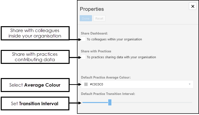 Enables colleagues to view your dashboard. - Share with Practices: To Practices sharing data with your organisation
