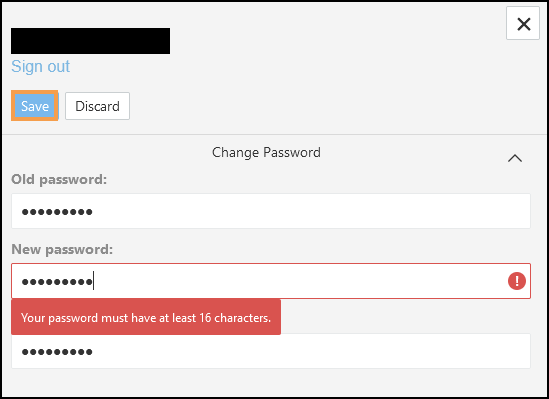 Note - Password must be at least 16 charactors. - If you do not want to change your password or to close the tab select Close