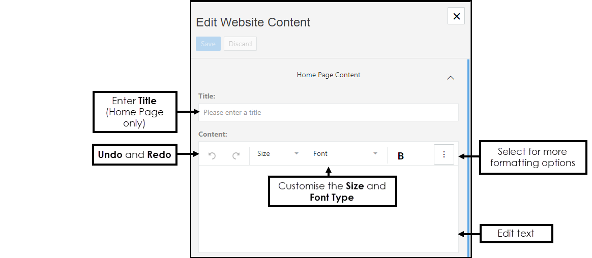 The Organisation Administrator manages the following Website Content which can be customised for your organisation: