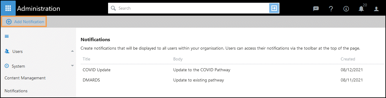 Organisation Administrators can create Notifications, for example, a Notification of a new Pathway.