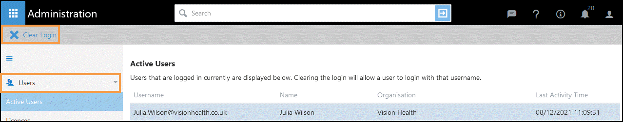 A list of Logged in users for your organisation displays.