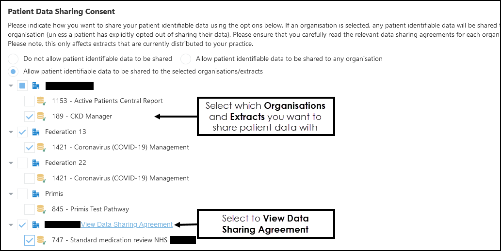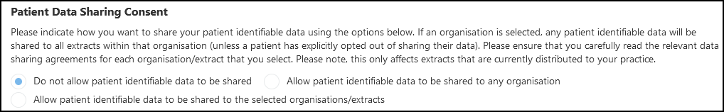 Shares data with any organisations your practice has a relationship with. - Allow patient identifiable data to be shared to the selected organisations/extracts