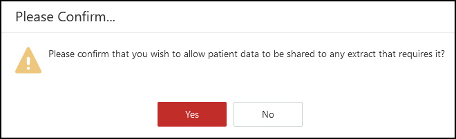 An alert displays 'Please confirm that you wish to allow patient data to be shared to any extract that requires it?'.