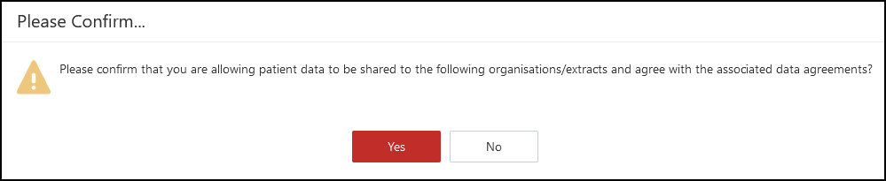 A notification 'Please confirm that you are allowing patient data to be shared to the following organisations/extracts and agree with the associated data agreements' displays.