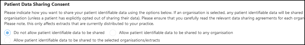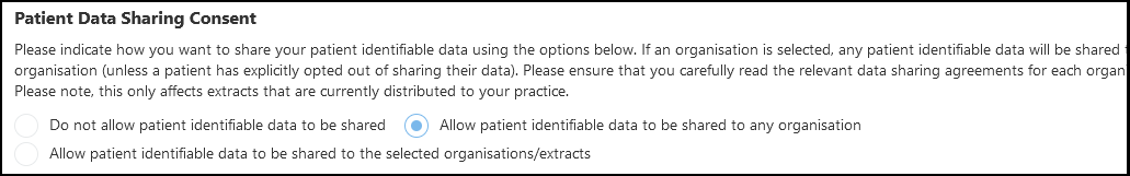 The Patient Data Sharing Consent options display. - Select the Allow patient identifiable data to be shared to any organisation check box.