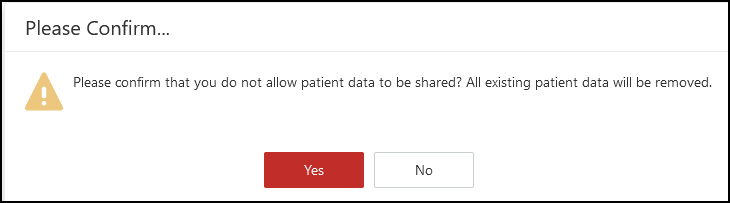 An alert displays 'Please confirm that you do not allow patient data to be shared? All existing patient data will be removed.'