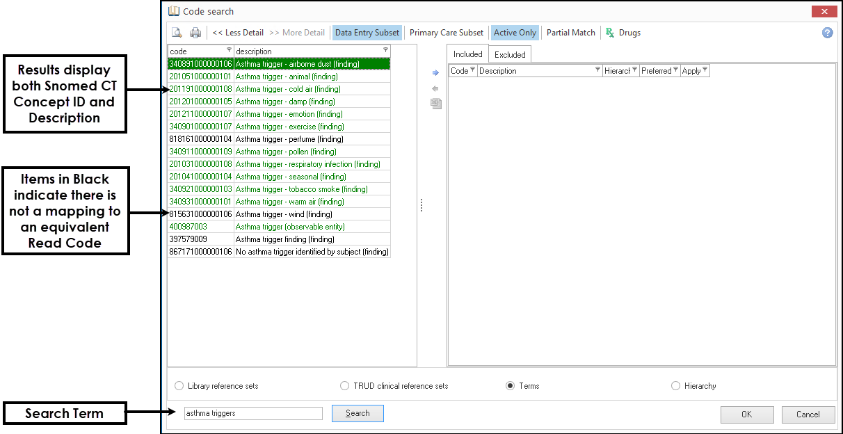 If the filter is removed inactive SNOMED CT codes also display, these items are red.Note - Inactive codes may still be used for searching on patient records. - Partial Match - Select Partial Match to search for part keywords. If this is not selected, only terms that exactly match your search display.