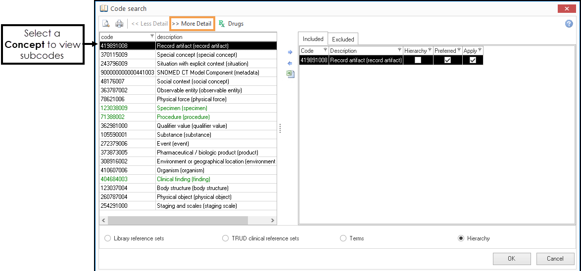 Select a Concept to view the codes in this section, if a code has children >>More Detail displays on the toolbar.