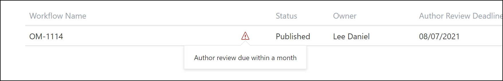 A notification displays next to the Workflow, one month before the set date until cleared.