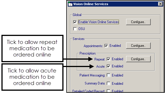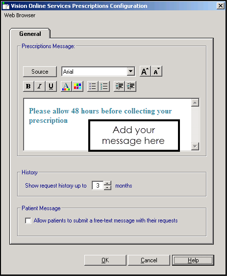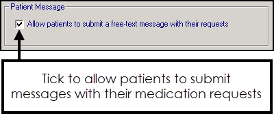 - Online Services - Prescriptions Configuration - General - Patient Message tick Allow patients to submit a free-text message with their requests: