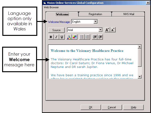 The message editor allows you to format online messages. It is available in the Welcome, Appointments and Prescription message configuration screens: