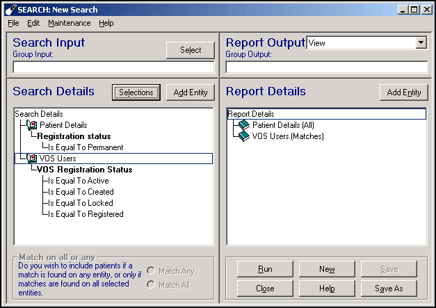 and the Search: New Search screen displays. - Highlight Patient Details on the left and select Selections.