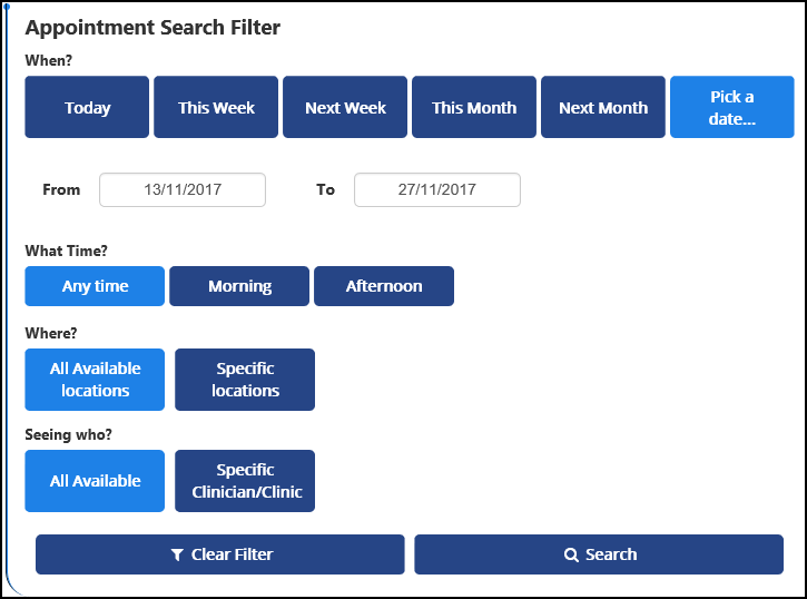 - The Appointments Search Filter screen displays, to fine tune the appointments that display, select your preferences: