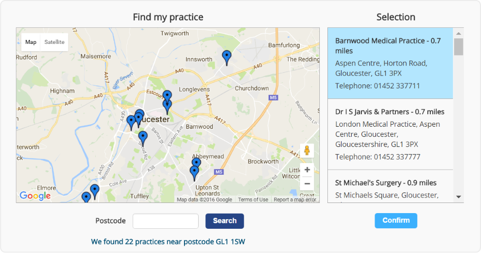 5. Select your practice on either the map or the list and select Confirm.