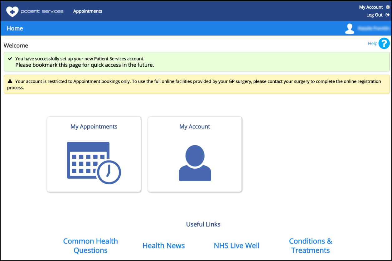 13. You are now presented with the Welcome screen and can book appointments at your GP Practice online: