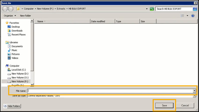 The Save As screen opens in P:\Extracts\HB BULK EXPORT, enter a name for the export file in File name: