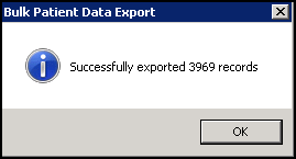 The export process starts, once it has run, the Bulk Patient Data Export - Successfully exported nnnnn records message displays, where nnnnn is the number of patient records exported, select OK: