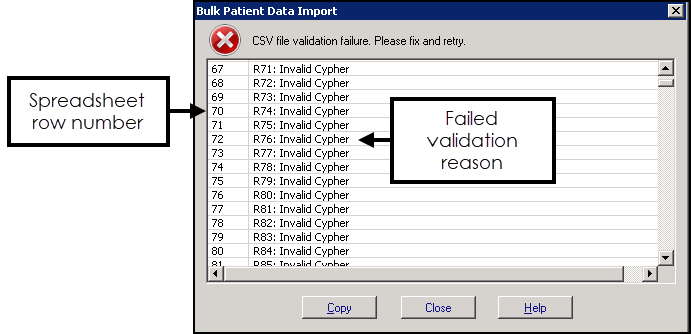 If there is a problem with the import, the Bulk Patient Data Import error message displays detailing the issue, select OK to rectify the issue and try again: