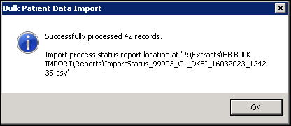 The process automatically continues. Once finished, the Bulk Patient Data Import - Successfully processed nnnnn records message displays, where nnnnn is the number of records processed, the following text details the location of the status report, it is important you make a note of this location. Select OK to close: