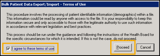 The Bulk Patient Data Export/Import - Terms of Use screen displays, read the message, tick I agree to these terms of use and then select Proceed: