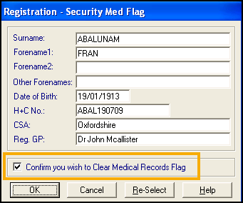 - Tick Confirm you wish to Clear Medical Record Flag and select OK: