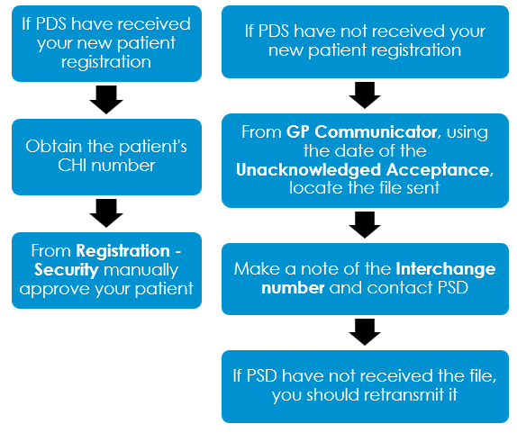 You should view your Unacknowledged Acceptances on a regular basis to make sure all new patients are accepted. For patients who have been registered for more than a week and are still in Unacknowledged Acceptances, you should contact PSD to see if they have received the registration. Below is a summary of what you need to do: