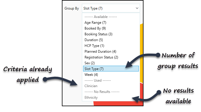 - If required change the Group By and Sort By options. As you select the drop down lists, a number in brackets indicates the number of results by category: