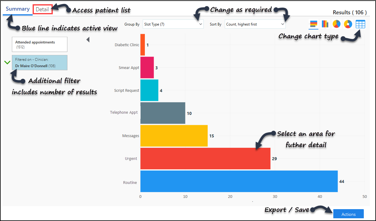 - Select an area of the chart you want to find out more about, for example, click a specific clinician's appointments. A filter applies and the view refreshes.