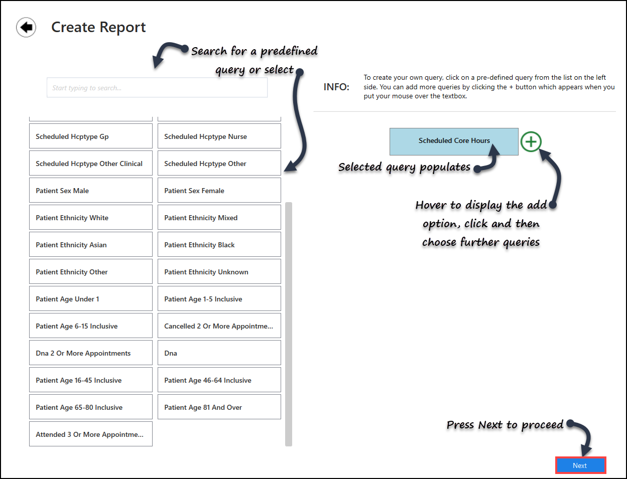button. A second text box displays. - Select an additional Query from the list. For example, Scheduled HCP type GP, to show GP appointments.