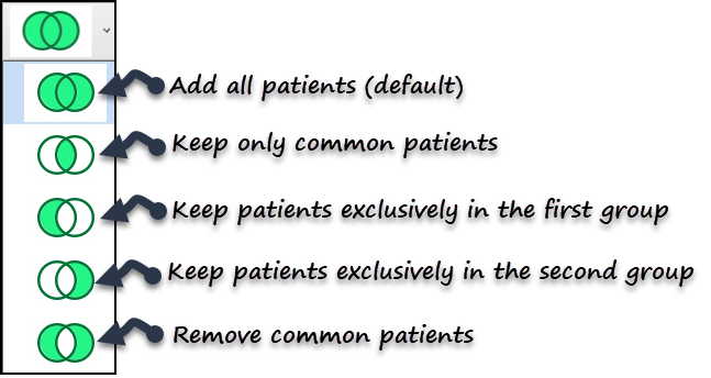 - Keep patients exclusively in the first group - Removes any patients that are in the both groups and does not import any patients in the joining group.