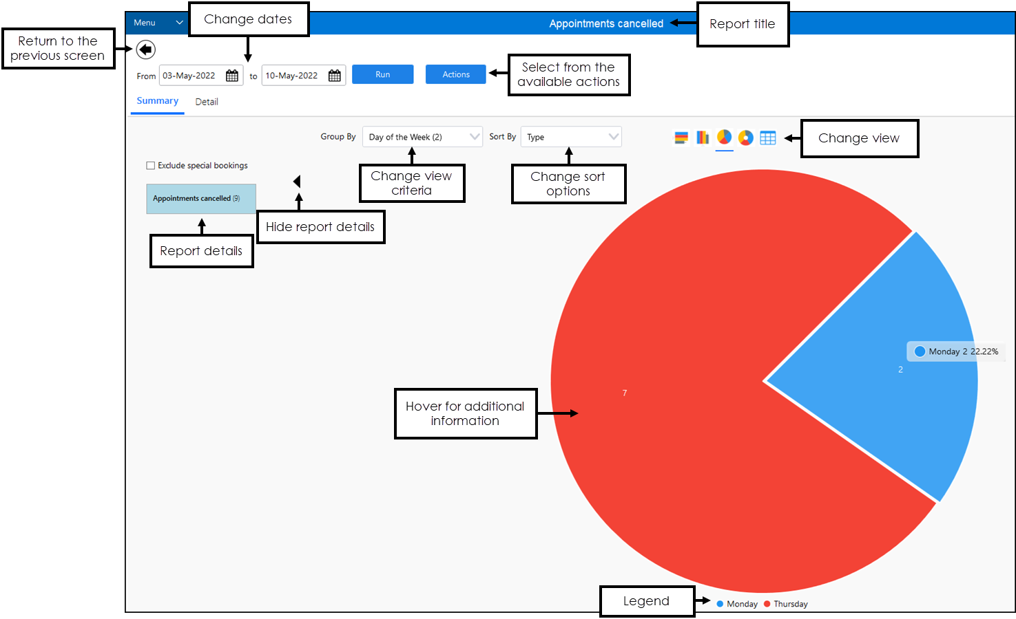 Note - If the selected Group By criteria is Week, then choosing Type displays the results by day order.
