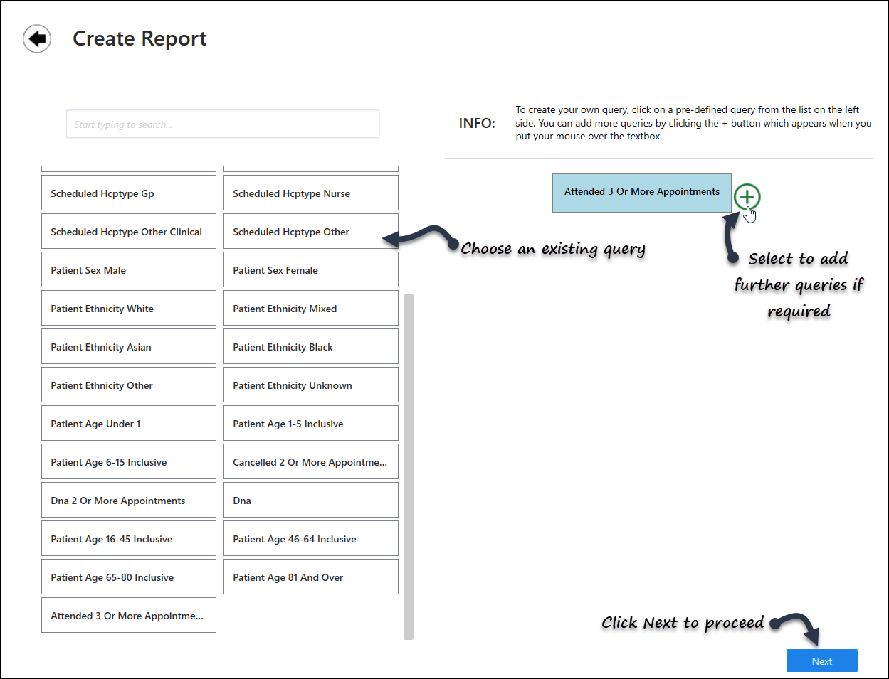 From the Report Library you can quickly create new reports based on the existing selections, and then add additional subsets of patients from the options available.