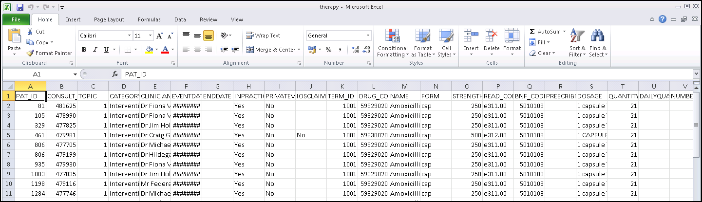 The following is an example of how to import a THERAPY.TXT file into Excel following the export of a Medication search as an Export Data (Tab Separated) file: