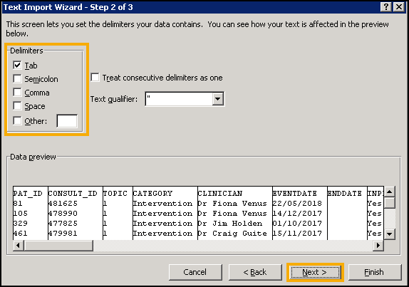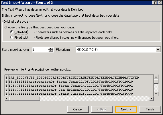- Select the file, in this example, THERAPY.TXT, select Open and the Text Import Wizard displays: