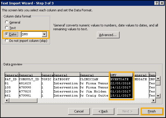 - The Step 3 screen displays, this allows you to select any columns containing a date and set the data format to Date. To do this, find and highlight the Event Date column and then set the Column data format to Date: