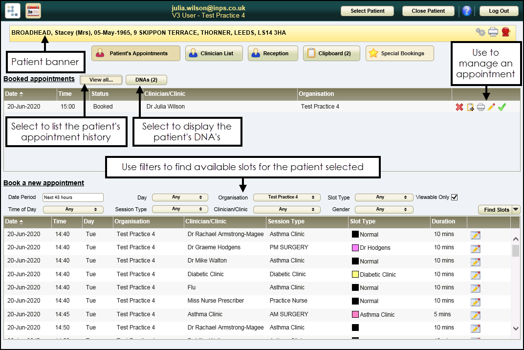 - View all appointments for a selected patient - See Viewing a Patient's Appointments for details.