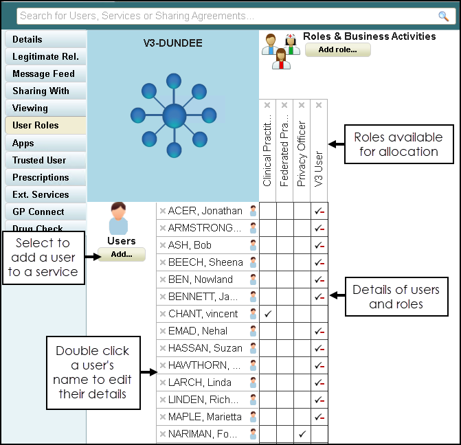 and the Service Details screen displays. - Find the user required, see Searching for Users, Services and Sharing Agreements for details if required.