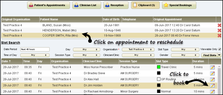 A booking confirmation message displays, and the re-scheduled item removed from the Clipboard.