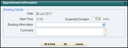 If required, record the Booking Information via the dropdown list and/or enter notes in the Comment box. - Click OK to confirm, or OK & Print to print an appointment label.