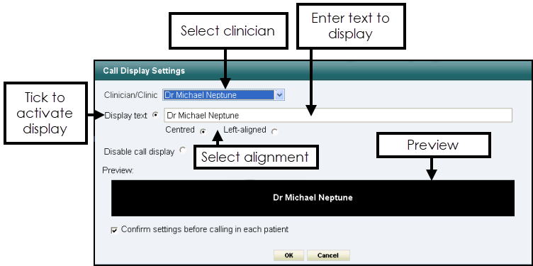 Confirm settings before calling in each patient - Tick to review and confirm settings before calling each patient. If left unticked, every time a clinician logs in to appointments and calls the first patient into consultation, the Call Display - User Options displays automatically.