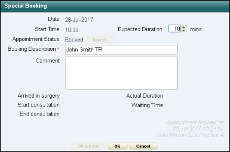 See - Extending an Appointment Duration - Revert the status of an appointment from Arrived back to booked, or from In Consultation back to Arrived, by clicking the Revert button.