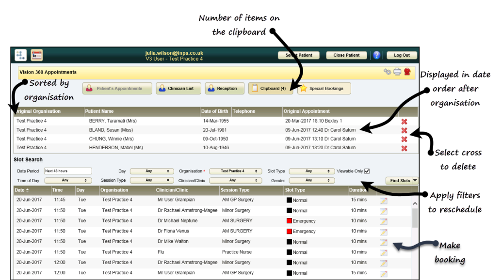 Items are displayed alphabetically by organisation then ordered by original appointment date and time.